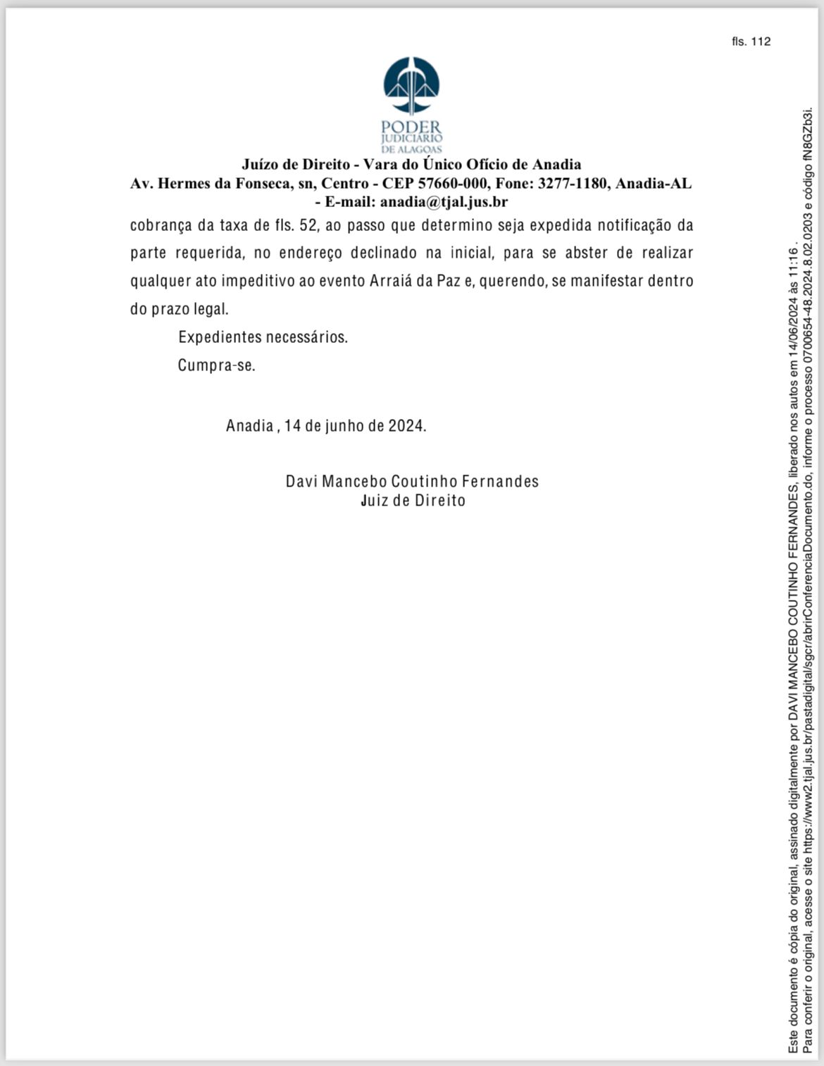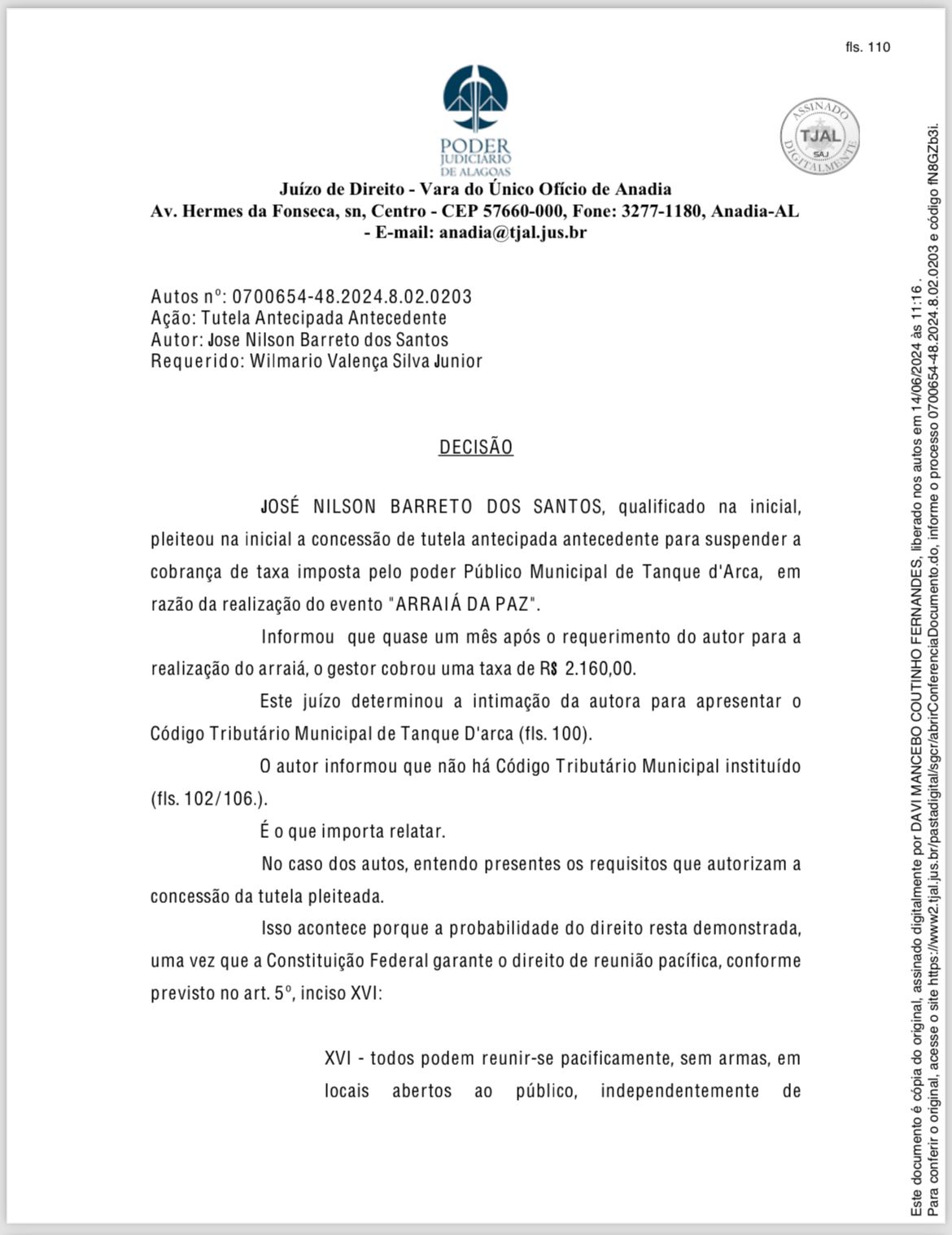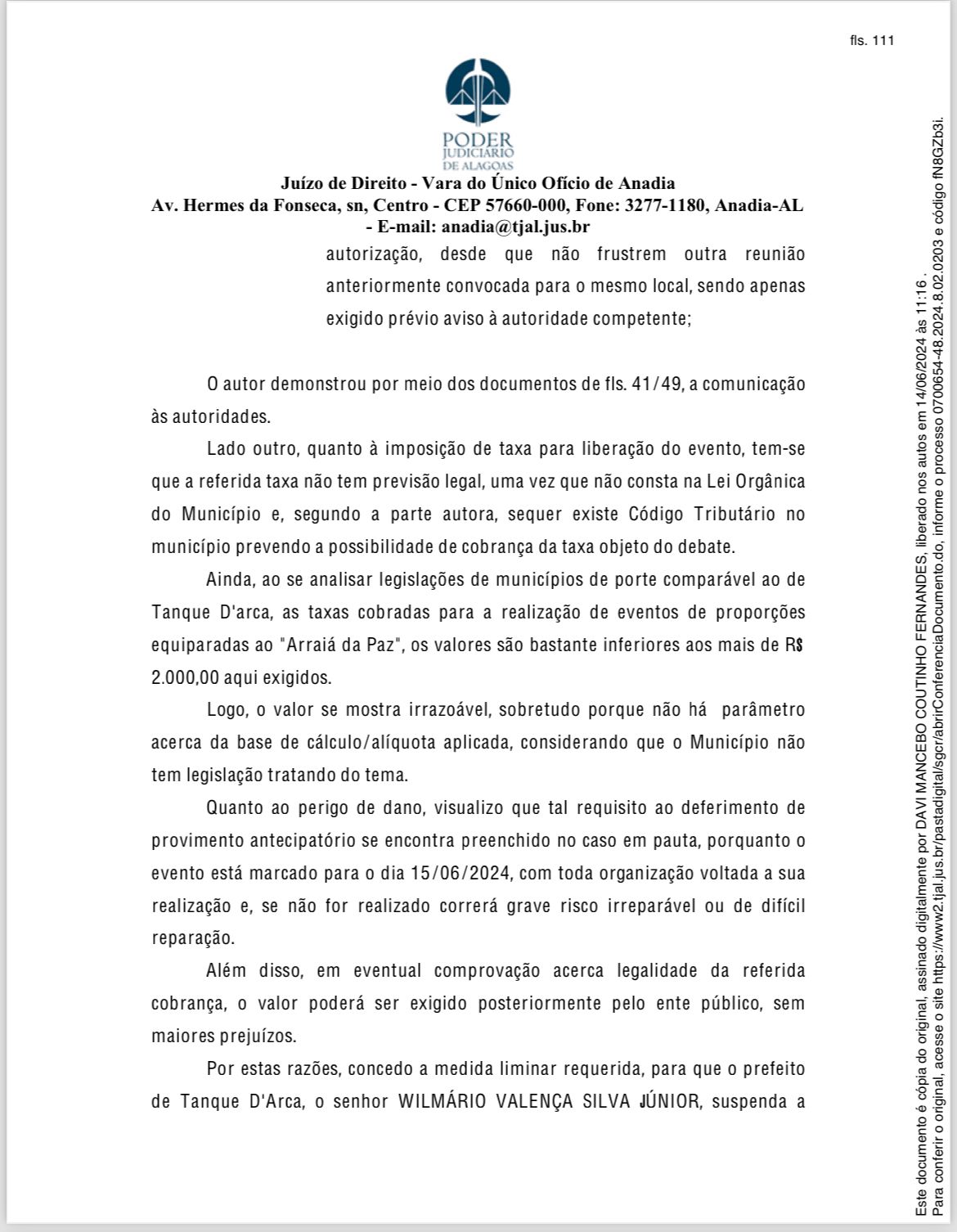 “Concedo a medida liminar requerida, para que o prefeito de Tanque D’Arca, o senhor WILMÁRIO VALENÇA SILVA JÚNIOR, suspenda a cobrança da taxa de fls. 52, ao passo que determino seja expedida notificação da parte requerida, no endereço declinado na inicial, para se abster de realizar qualquer ato impeditivo ao evento Arraiá da Paz e, querendo, se manifestar dentro do prazo legal”.